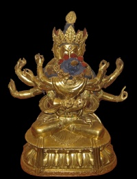 Attribute: Schwert, Vajra, Beil, Seilschlinge (Pasha), zähnefletschend, dreiäugig, oft sechsarmig